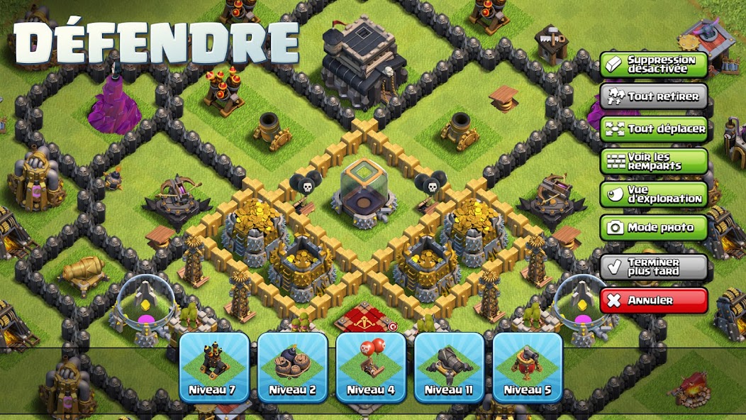 Entraînez vos troupes dans les casernes, choisissez des sorts dans les usines spécialisées et construisez des machines de siège. Participez à des batailles pour piller les ressources d'autres villages et utilisez les récompenses pour renforcer davantage votre base.