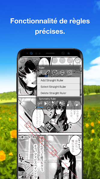 Ibis Paint X propose une fonction d’enregistrement du processus de dessin, idéale pour enseigner ou analyser son art. Parmi les outils inclus, on trouve des règles pour la symétrie, la stabilisation des traits, ainsi que des masques et des règles pour les lignes radiales.