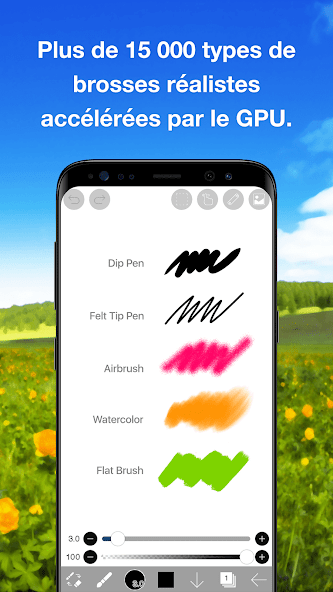 L'application met à disposition plus de 15 000 pinceaux, incluant des stylos numériques et classiques, des crayons, des pinceaux ronds et plats, des aérosols, du fusain et bien plus encore. Vous y trouverez également 27 modes de fusion des pinceaux, 80 filtres variés, de nombreuses textures de traits et 46 trames uniques.