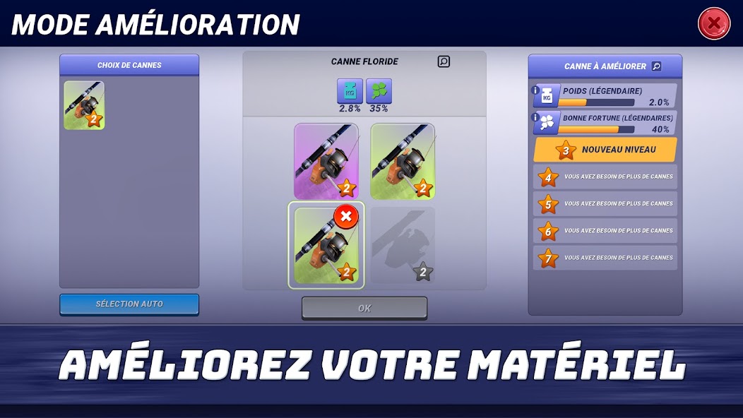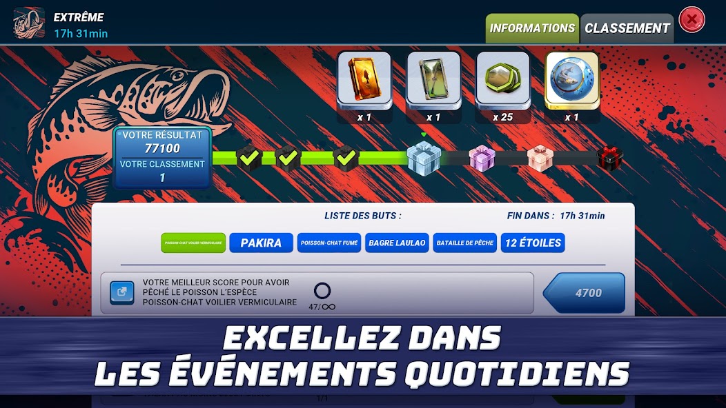 Pour les amateurs de défis, le jeu propose des duels, des tournois et des matchs en équipe où vous pouvez tester votre agilité et votre capacité à répondre rapidement aux défis. Les quêtes vous donnent la possibilité de gagner des récompenses rares pour améliorer votre équipement ou développer vos compétences. Participez à des batailles de clans pour explorer encore plus d'opportunités de pêche en compagnie d'alliés partageant les mêmes passions.