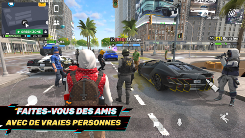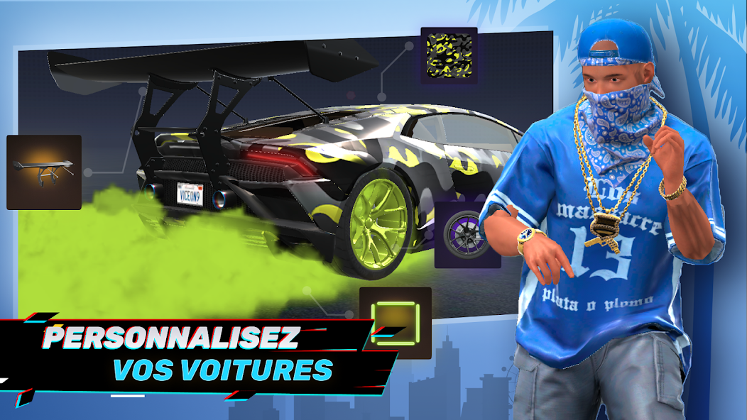 Les lieux d’action vous plongent dans des rues qui rappellent New York, Miami ou Los Angeles. Choisissez votre mode de déplacement — à pied ou en voiture. Les véhicules ne sont pas seulement des moyens de transport, mais également des outils pour des courses, des poursuites ou des évasions. Et si la puissance du moteur ne vous satisfait plus, vous pouvez améliorer votre voiture, autant sur le plan esthétique que technique.