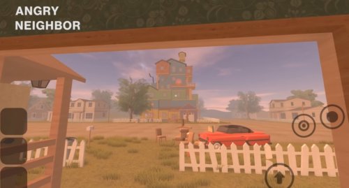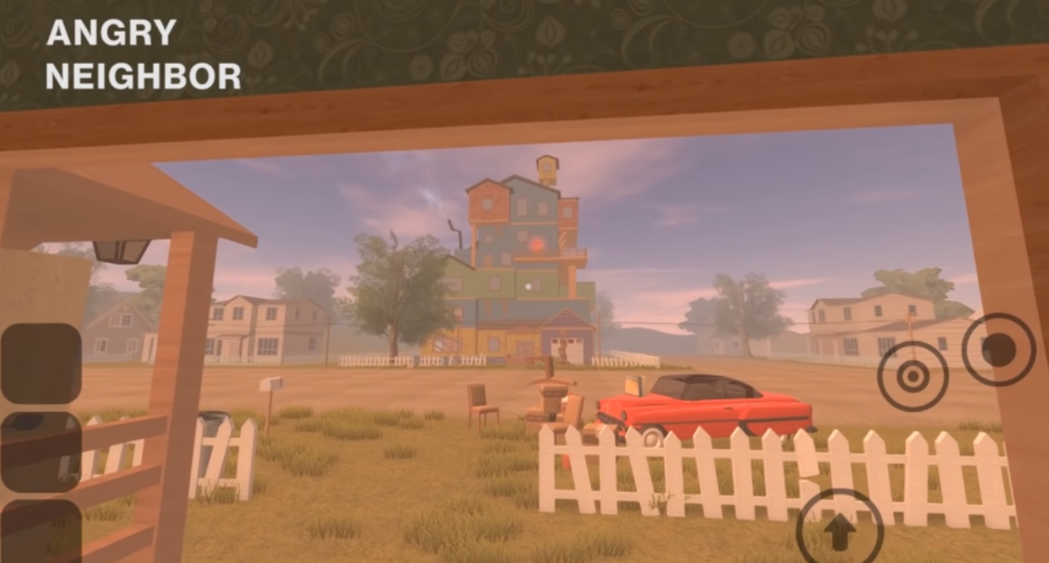 Angry Neighbor — votre aventure commence dans une rue paisible près d'une mystérieuse voiture rouge.