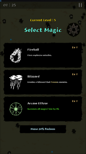 Vous contrôlez votre personnage à l'aide d'un joystick analogique virtuel, et vous choisissez vos attaques et capacités magiques à chaque nouveau niveau. Chaque partie est unique grâce aux améliorations aléatoires et aux combinaisons de sorts que vous sélectionnez. Perdre fait partie du jeu, mais chaque nouvelle tentative vous rapporte des points de recherche que vous pouvez dépenser pour des améliorations permanentes.