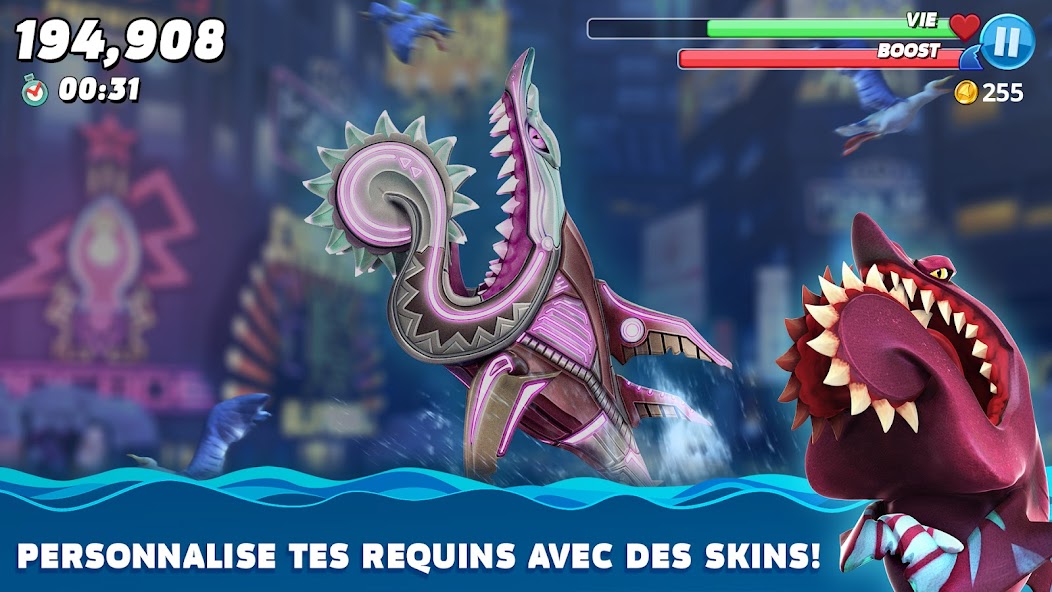 - Des possibilités d’amélioration infinies. Améliorez la vitesse, la puissance de morsure et l’accélération de vos requins pour les rendre encore plus redoutables. Équipez-les d'accessoires originaux comme des jetpacks, des parapluies et même des casques stylés.