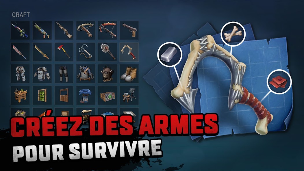 - Fabriquez des outils et des armes tels que des cannes à pêche, des lances et des dispositifs de dessalement pour pourvoir à vos besoins essentiels.