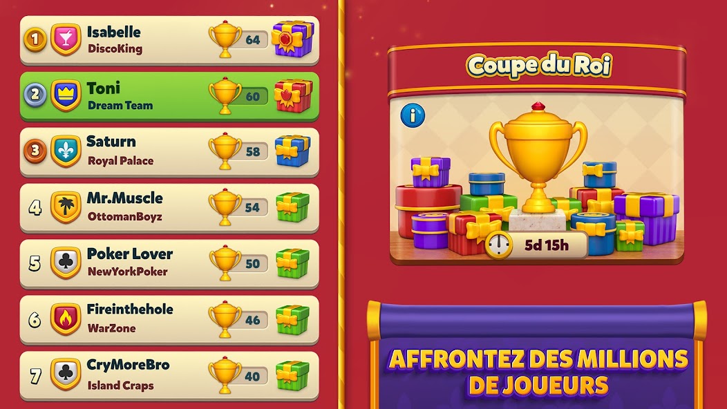 Le monde de Royal Match est constitué de lieux vifs et colorés, chacun ayant une ambiance unique. Vous découvrirez des pièces traditionnelles comme la Salle du Trône et l'Observatoire, ainsi que des endroits insolites comme une Patinoire ou une Confiserie. Ces lieux reflètent le caractère du roi Robert en combinant la tradition à des idées amusantes et originales. Chaque découverte rend votre aventure inoubliable!