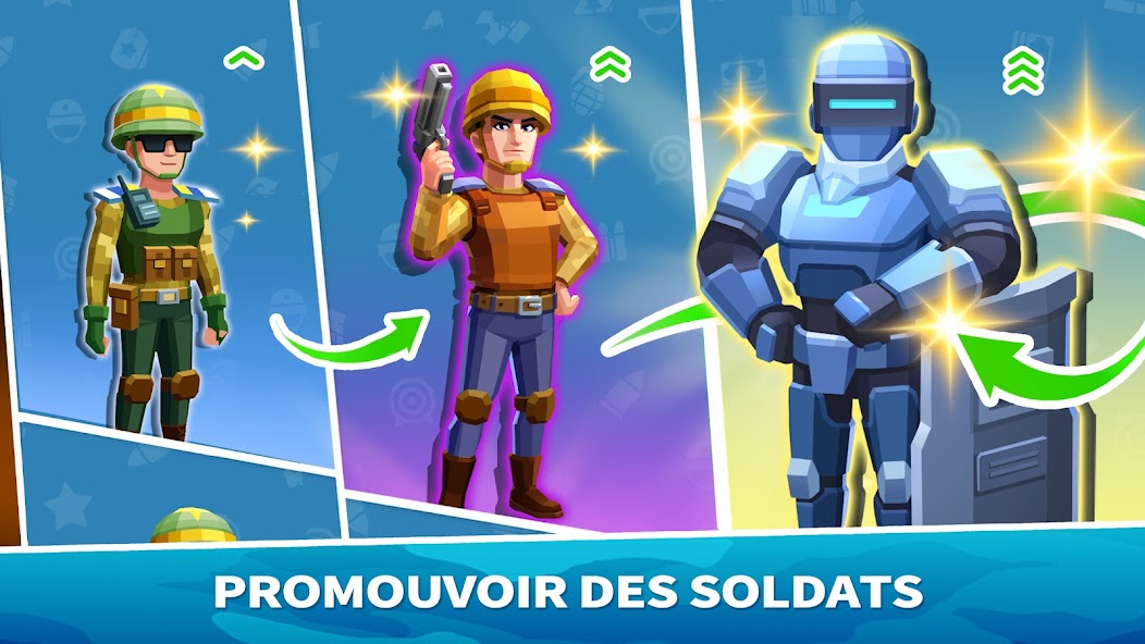 Army Tycoon : Idle Base est un simulateur stratégique où vous prenez la tête d'une base militaire et la transformez en un puissant empire. Votre mission consiste à créer une armée d'élite, organiser des formations intensives et renforcer vos positions dans le domaine de la tactique militaire. Chaque étape, qu'il s'agisse de construire des terrains d'entraînement ou de choisir les bonnes stratégies, vous rapproche du titre de véritable magnat militaire.